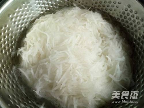 2推成萝卜丝放去容器,加一勺盐腌制,把萝卜中的水腌出来。
