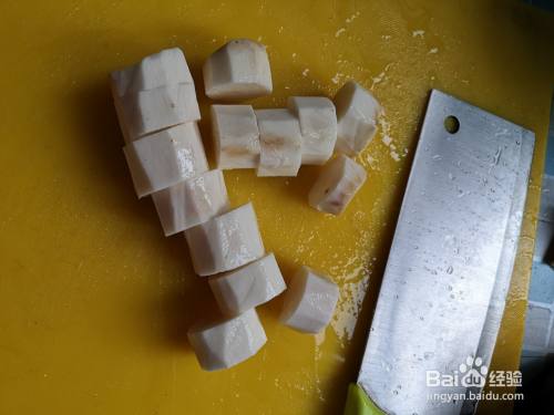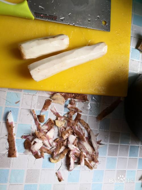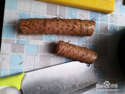 这个步骤一定要用手套,可以用一次性手套,因为处理山药会比较容易过敏,导致手部很痒。先戴上手套,清洗下山药棒,然后用刀去皮,再冲洗干净,再切断。