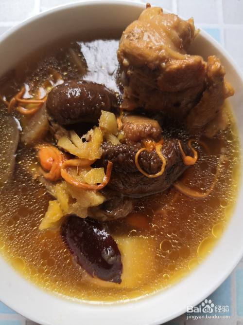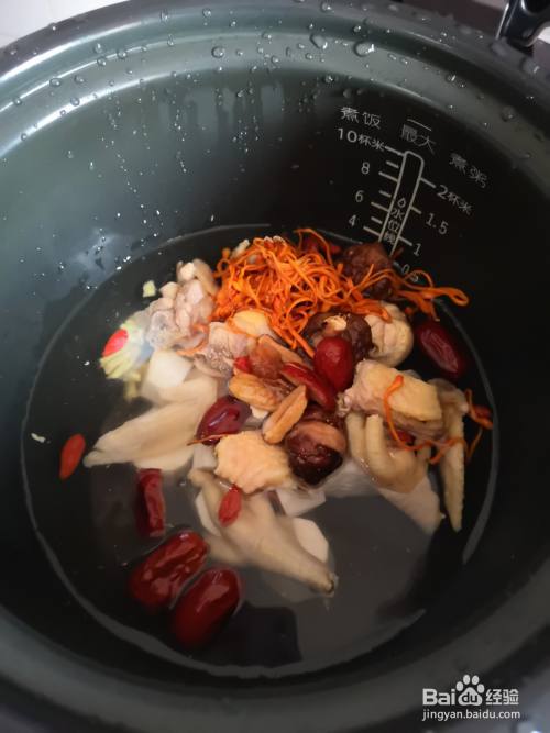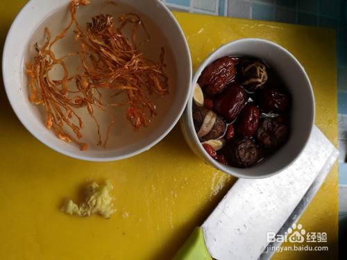 红枣大概4—5个,香菇3—5朵,姜片少许,虫草花少许,枸杞少许。黄芪片大概2—3片,桂圆1—3小粒。