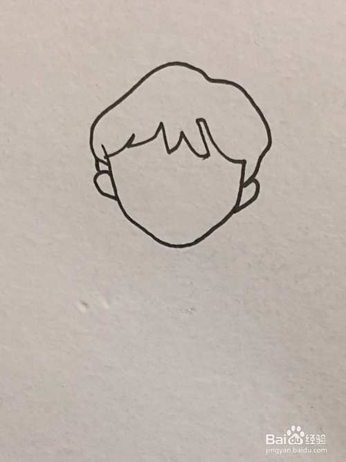 首先在白纸上,用黑色碳素笔画出人物的头部轮廓。在其头顶画出发型,我们在发型上画出发丝纹理。