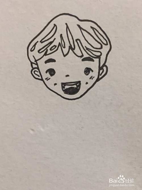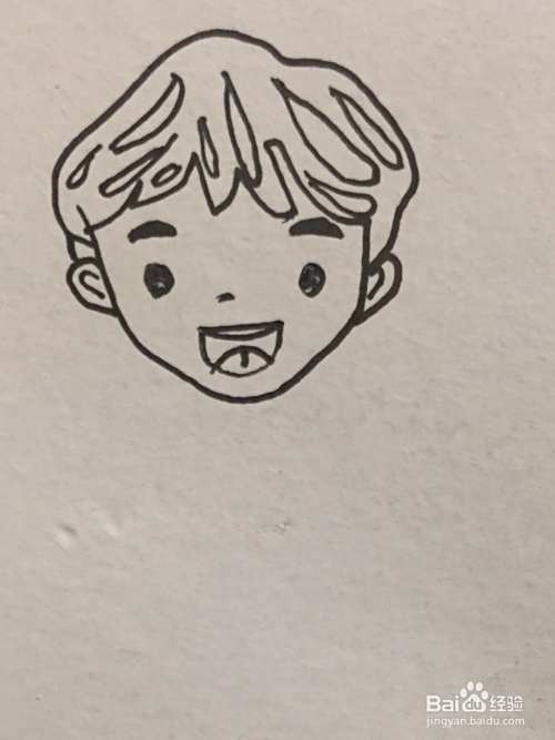 用笔画出男孩的五官,在其下巴处线条下沿画出男孩的服装。服装的画法可参见如下图所示。