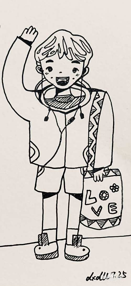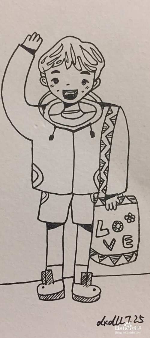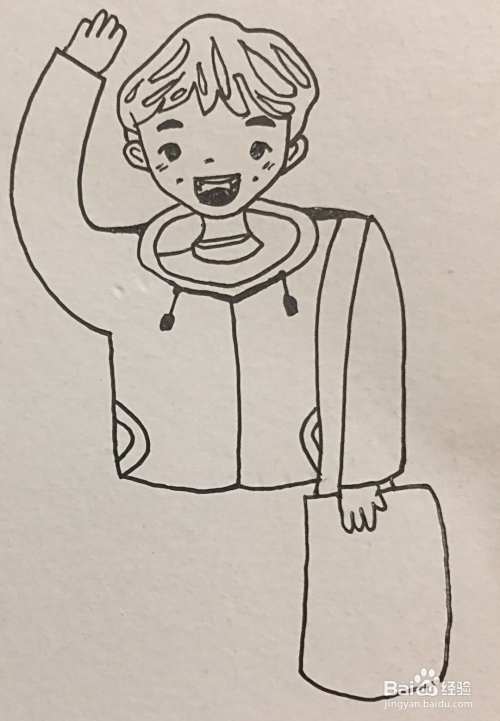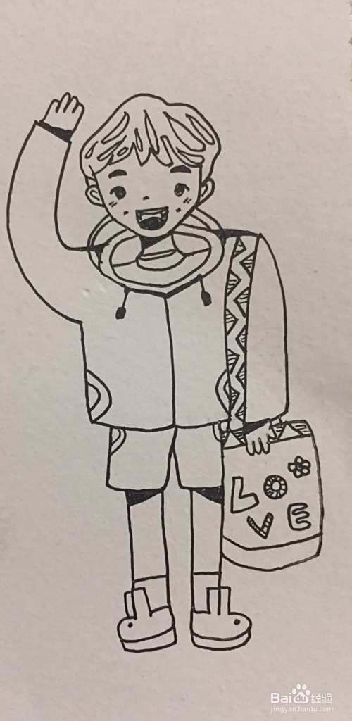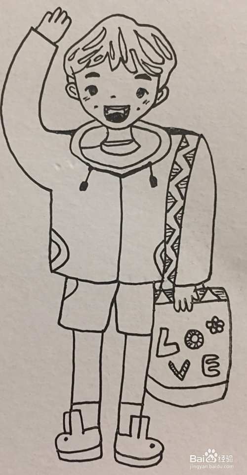 我们在其服装袖口处画出双手,在其肩膀一侧画出包包。用笔画出男孩的双腿和鞋子。