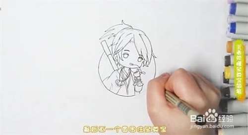 接着画出至尊宝层层叠叠的衣服,还有正在比心的左手,在脖子上画上一个吊坠,后面画上金箍棒,最后再画上一个圆圈围住至尊宝。
