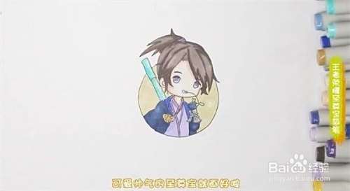 把至尊宝的眼睛涂成紫色瞳孔,然后用藏蓝色、紫色等颜色涂衣服,金箍棒涂成青色,最后用土黄色涂圆圈背景,画上白色装饰,可爱帅气的王者荣耀至尊宝就画好了。
