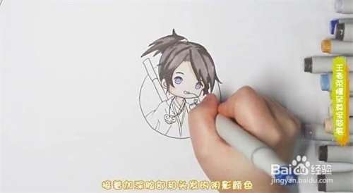 接下来来世给至尊宝上色,先用肤色涂至尊宝的脸部和脖子,然后用深棕色涂头发,再不断加深头发和脸部的阴影颜色。