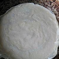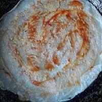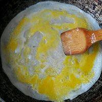 两勺面糊快速在平底锅摊匀~做成薄饼~不要用油(加了油容易滑不好摊成饼)~如果锅平比较干容易粘锅,抹几滴薄薄一层即可,锅一定烧热~当然不能烧冒烟~根据自家燃气灶掌握火候