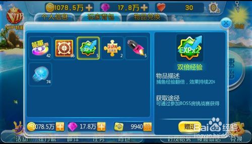 捕鱼经验翻倍,效果20秒。这算是一种老道具了,不属于新版本出新的范畴,相信大家都非常熟悉,升级利器,可以和各种其他道具叠加效果,想想看,在用全屏炸弹一夜暴富的时候用双倍经验,那升级不要太快噢!