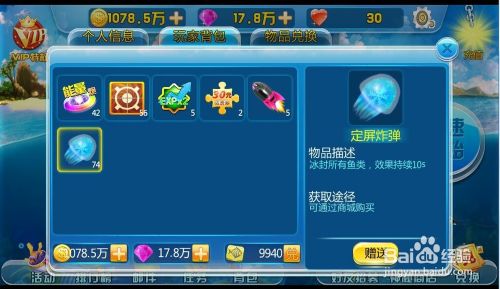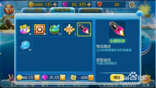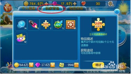 首先依然是点击游戏主页面的背包,在玩家背包这一栏可以让你看到自己的道具有哪些。今天我们主要介绍街机竞技捕鱼的物种常用道具,共五种,分别为定屏炸弹、全屏炸弹、双倍经验、锁定和能量炮。
