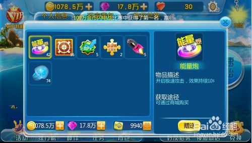 充斥能量,开启极速攻击,持续10秒效果。这个道具也十分炫酷,七彩光芒闪烁,能量全开,让人心潮澎湃。这款道具适合在鱼潮或者大鱼、BOSS出现等情况下使用,虽然时长较短,但是效果很好。