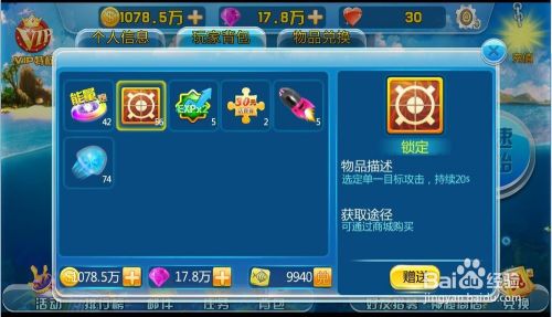 可选定单一目标持续攻击,持续20秒效果,这是一款厉害的大鱼专攻道具,当你想要攻下某一只金蟾、黄金鲨、海豚、BOSS鱼等高倍率大鱼时,可以用这个道具全程锁定目标自动攻击。