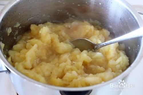 水份减少,取一勺子,划散一下(但不要操底),苹果即成为小的颗粒,但还有个别的有点硬,盖锅继续熬。