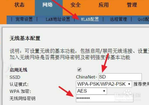 进入SSID设置,给无线信号起个名字,搜索信号的时候可以看到它,SSID选择1,然后进行无线网络密码设置。