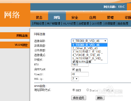 当以超级用户名登陆后,可以查询,配置和修改所有的设置。先从配置宽带连接开始,按下图来配置(注意端口绑定部分,2是没有勾选的,因为那是用来放IPTV的),VLANID用自己的值,这样配好以后,光猫就能自动拨号上网了。