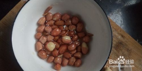 花生米冷水淘洗干净倒入碗中,鸡蛋磕入杯中分离出蛋清,将蛋清淋入碗中的花生米。