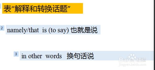最后,我们来一起看下,表示"解释和转移问题"的词语有哪些呢?比如,namely/that is (to say)。