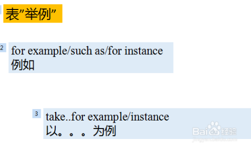 在上次课中,我们一起学习了表示“开始”,“总结”,“次序”等等的单词。那我们今天就接着往下学习吧。我们先来看下,表示“举例”的一些单词,比如,for example/such as/for instance