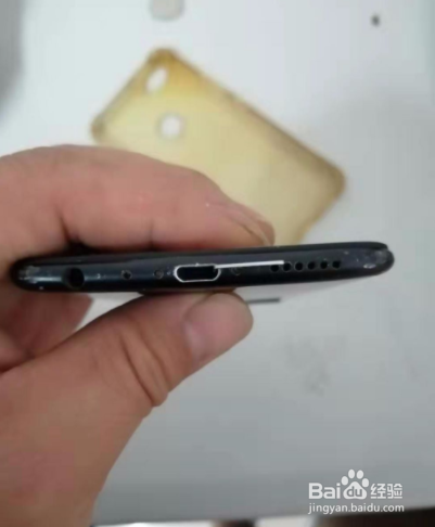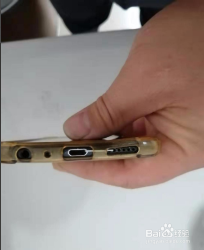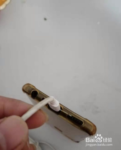 然后取下手机保护套,将钉书钉放入手机充电口内阶梯口任意一侧,短的一端向内。