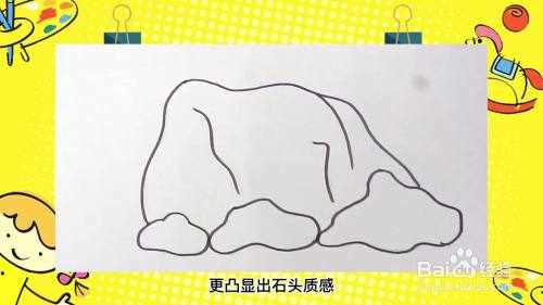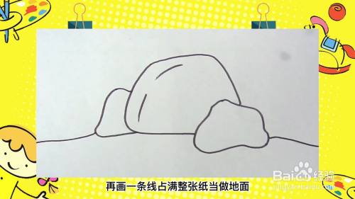 接下来在大石头里面画两条线体现出立体感,再画一条线占满整张纸当作地面。