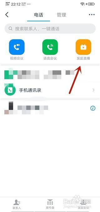 2、然后在打开的电话界面,点击【发起直播】功能。