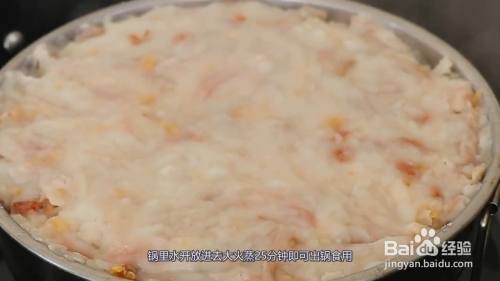 倒进平底盘用铲子压平,锅里水开放进去大火蒸25分钟即可出锅食用。