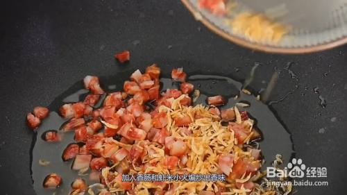 起锅烧油,加入香肠和虾米小火煸炒出香味,倒入香芋条翻炒均匀。加入食用盐、2克五香粉调味,倒入米浆,快速翻拌均匀。