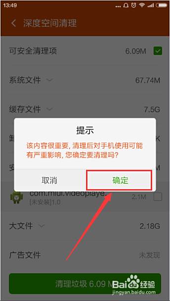 紧接着会有一个提示面板提醒你该内容可能很重要,清理后可能影响手机使用,确定要清理吗?点击确定按钮