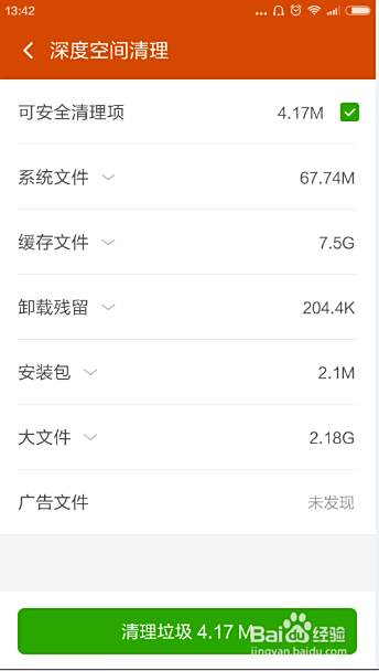 扫描完成后下方会显示可安全清理项这个是默认选择清理,其他的像“系统文件”,“缓存文件”,“卸载残留”,“安装包”,“大文件”,“广告文件”等垃圾需要手动清理。
