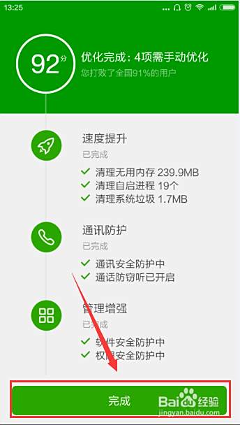 然后软件会扫描手机垃圾,并自动优化,可以看到手机清理垃圾的数据,还有一些垃圾需要手动清理优化,下拉可以看到优化的内容,点击“完成”快速清理优化完成。