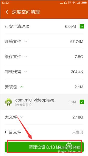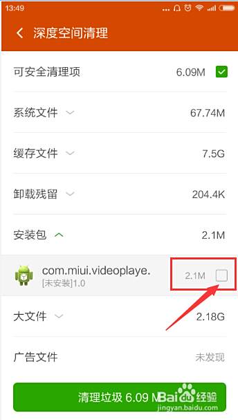 比如要清理安装包下的安装包残留,点击安装包会显示手机残留的安装包,勾选相应安装包后的复选框。