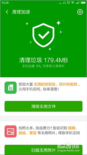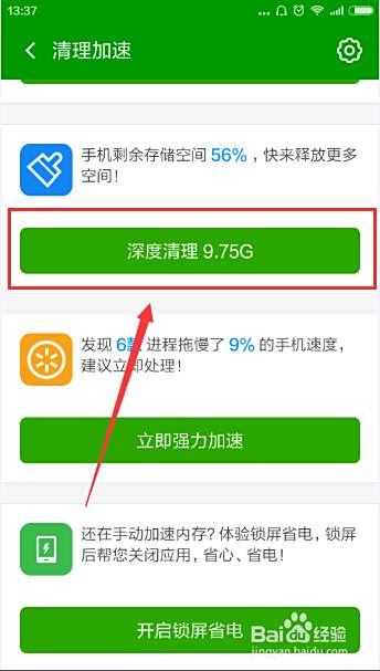 正常清理完成后,如果想手动清理手机中下载的文件或图片,需要下滑至下方点击“深度清理”按钮