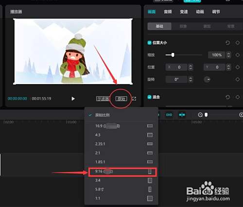 点击播放器右下角的“原始”按钮,在弹出的菜单中就可以选择9:16的比例了。