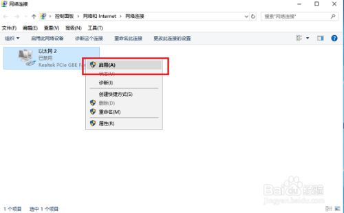 第一步我们首先进去网络连接界面,尝试一下禁用启用网络连接,查看网络是否正常,如下图所示: