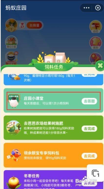 进入饲料任务,选择庄园小课堂,点击去答题。