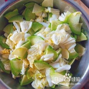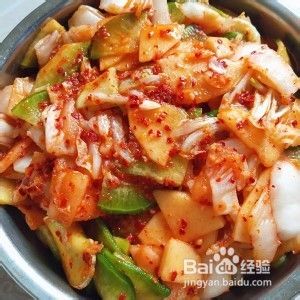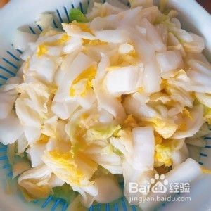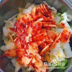 把切好的苹果,梨。蒜,姜倒辣椒面里拌匀。在倒沥好水的白菜里。