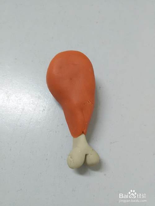 把鸡腿下方的缝隙捏光滑,让桔色彩泥包住白色彩泥。
