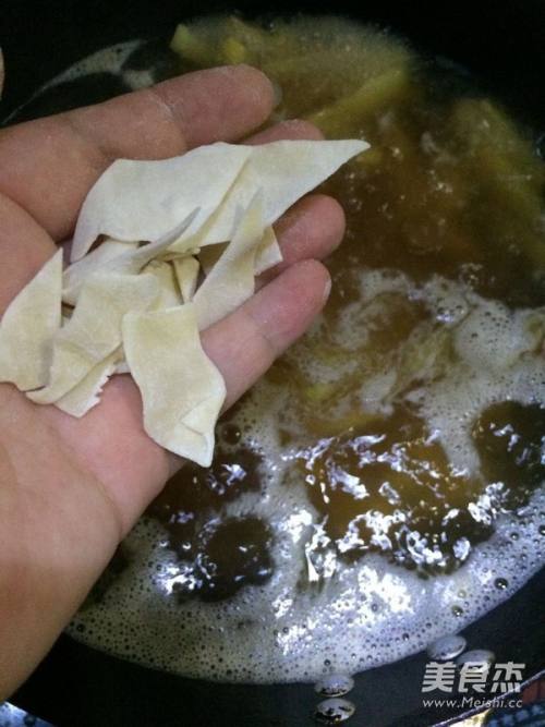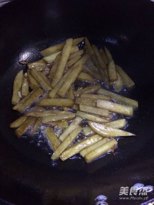 2锅中放入油,放入葱花爆香,加入土豆条翻炒