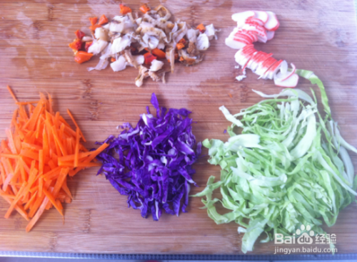 蔬菜切丝,蟹棒扇贝肉切小块