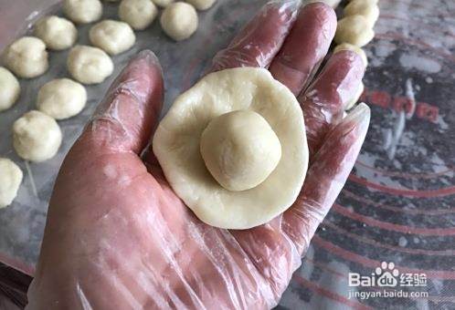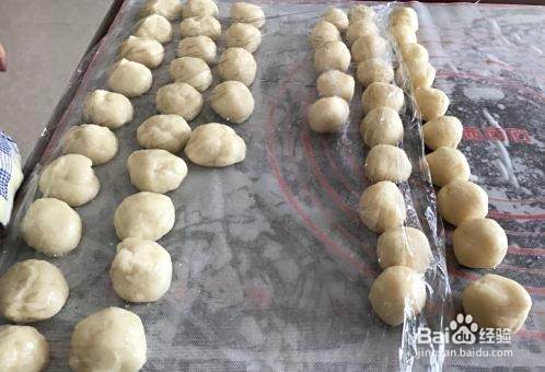 油皮(左)和油酥(右)分别都分成25等份,油皮要比油酥大一点点 我这油皮和油酥约为13g:11g 天气干燥,最好盖上保鲜膜以防表皮风干