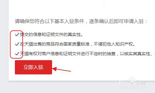 在入驻界面向下拉,勾选三个选项,点击立即入驻。