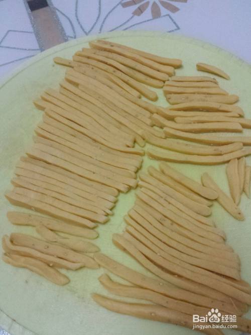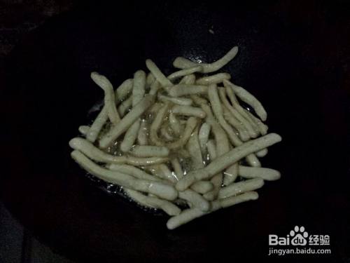 因为是晚上,光线不好,放入油锅中炸至泛黄即可! (测试油温: 开中火,油烧一小会儿,放一根切好的细条,如果细条下锅炸很快浮上来,那油温就适合啦!)