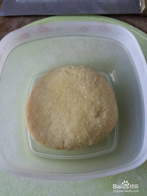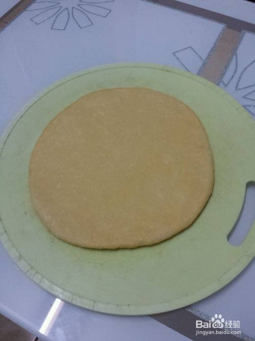 把静置半小时的面团取出擀成饼状,不要太厚,大概5-6mm左右。