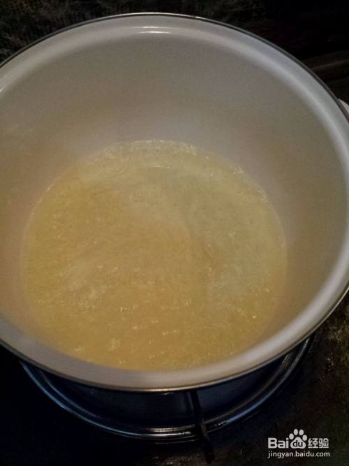 原谅我中途换锅,那个白色珐琅锅口径太小,熬制糖稀比较慢。建议用口径大一点的不粘锅。 冰糖融化后,加入少量蜂蜜,中小火不停的搅拌,搅拌至粘稠状关火。