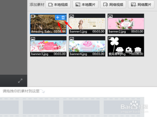 6素材导入完成后就可以把它加入时间线上了,最后导出的视频会按照时间线上的顺序播放。鼠标移到素材图片上会显示2个小图标,一个是添加素材到时间线另一个是删除素材。