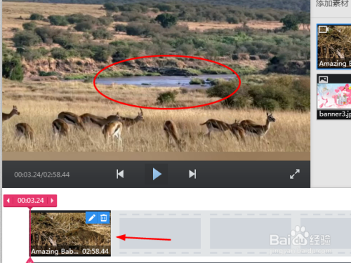 7点击【添加素材到时间线】,素材加入成功,显示在时间线上。显示区域可以直接观看效果。