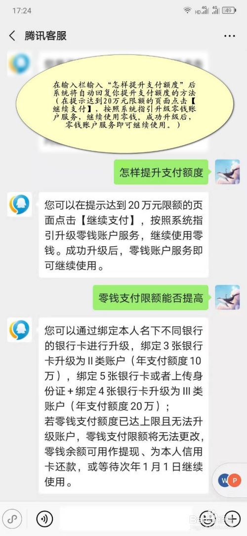 在输入栏输入“怎样提升支付额度”后系统将自动回复你提升支付额度的方法(具体方法如图所示)。
