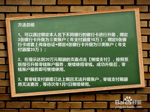 1、可以通过绑定本人名下不同银行的银行卡进行升级,绑定3张银行卡升级为Ⅱ类账户(年支付额度10万),绑定5张银行卡或者上传身份证+绑定4张银行卡升级为Ⅲ类账户(年支付额度20万);