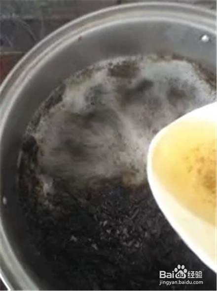 把锅清洗干净,然后倒入水,打开火烧开,放入紫菜,然后在上面倒入1汤匙油,要保证油充足,紫菜才会入味。