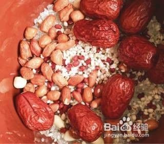 花生、大米/糯米、红枣洗净备用,沥干水分(若用电饭锅煮的话,食材洗净可以泡半个小时更易软烂)