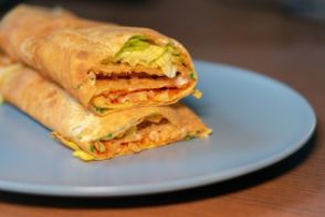 最后将脆皮放到薄饼上,并加上火腿,肉松等配料,卷在一起,就可以开吃了。