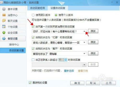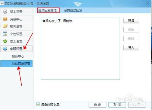 在系统设置窗口选择最下面的客服设置,选择自动回复设置,再点击一下自动回复短语,点击新增,输入您想设置的自动回复内容
